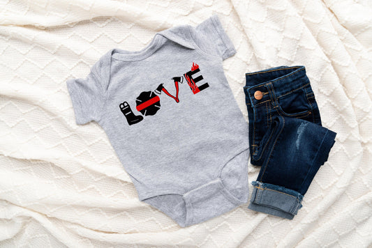 LOVE Firefighters Baby Creeper - Fireman - Thin Red Line Flag - First Responder - Firefighter - Red Lives Matter - Creeper Bodysuit