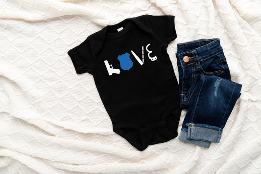 LOVE Police Baby Creeper - Law Enforcement - Thin Blue Line- Police Flag - American Flag - Blue Line Flag - Creeper Bodysuit Romper