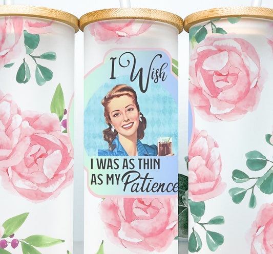 I Wish I Was As Thin As My Patience 25oz Frosted Glass Tumbler, Floral Tumbler, Funny Tumbler Sarcastic Tumbler