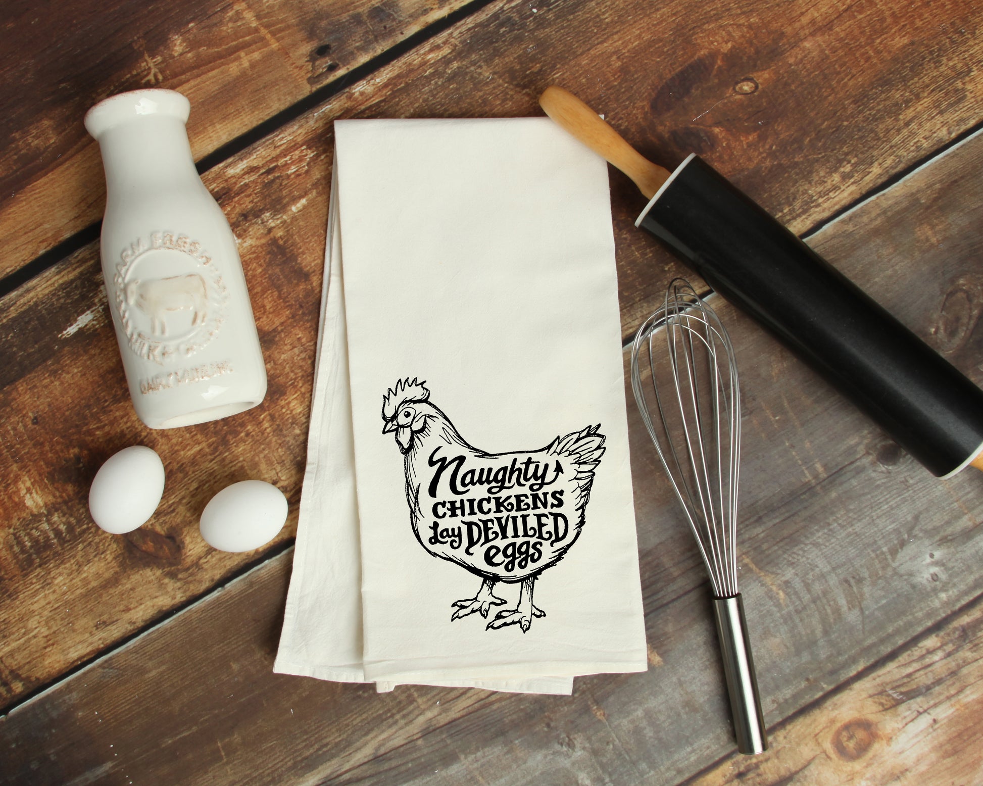 Naughty Chickens Lay Deviled Eggs - Funny Kitchen Tea Towels - Humorous Flour Sack Dish Towel - Hilarious Housewarming Gift Kitchen Decor