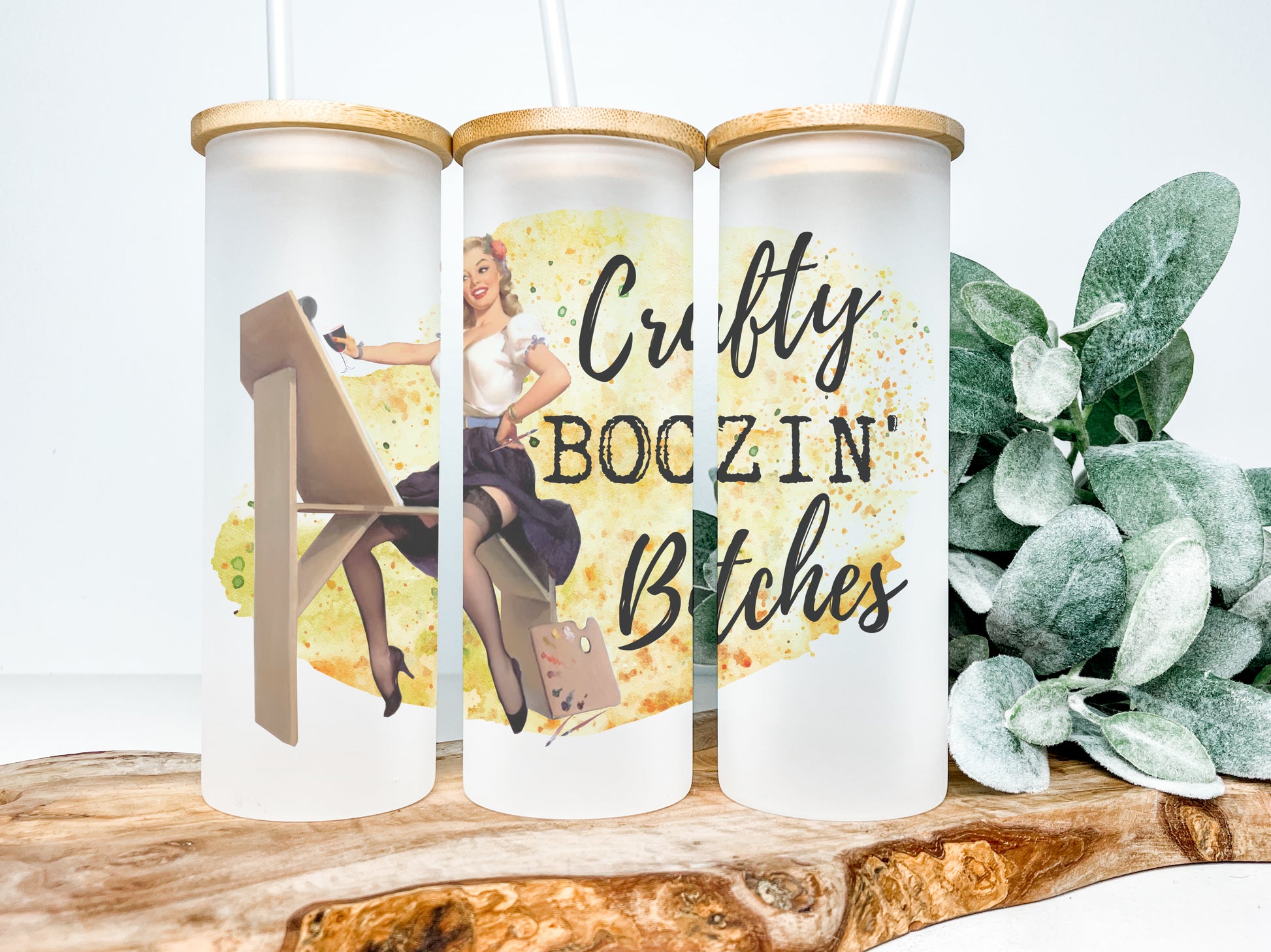 Crafty Boozin' Bitches 25oz Frosted Glass Tumbler, Funny Retro Housewives Tumbler
