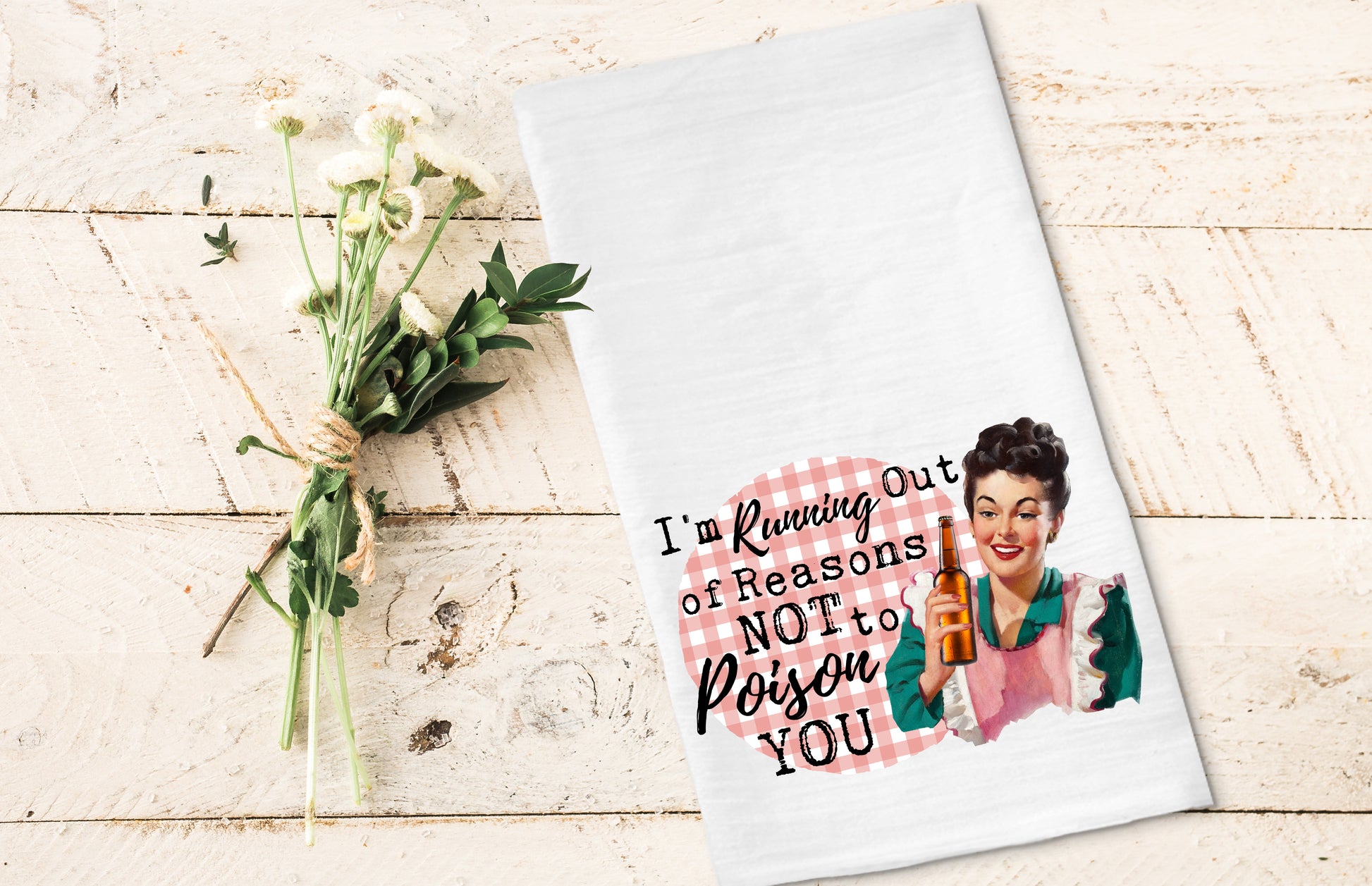 I'm Running Out of Reasons - Funny Kitchen Tea Towels - Humorous Flour Sack Dish Towel - Hilarious Housewarming Gift Kitchen Decor