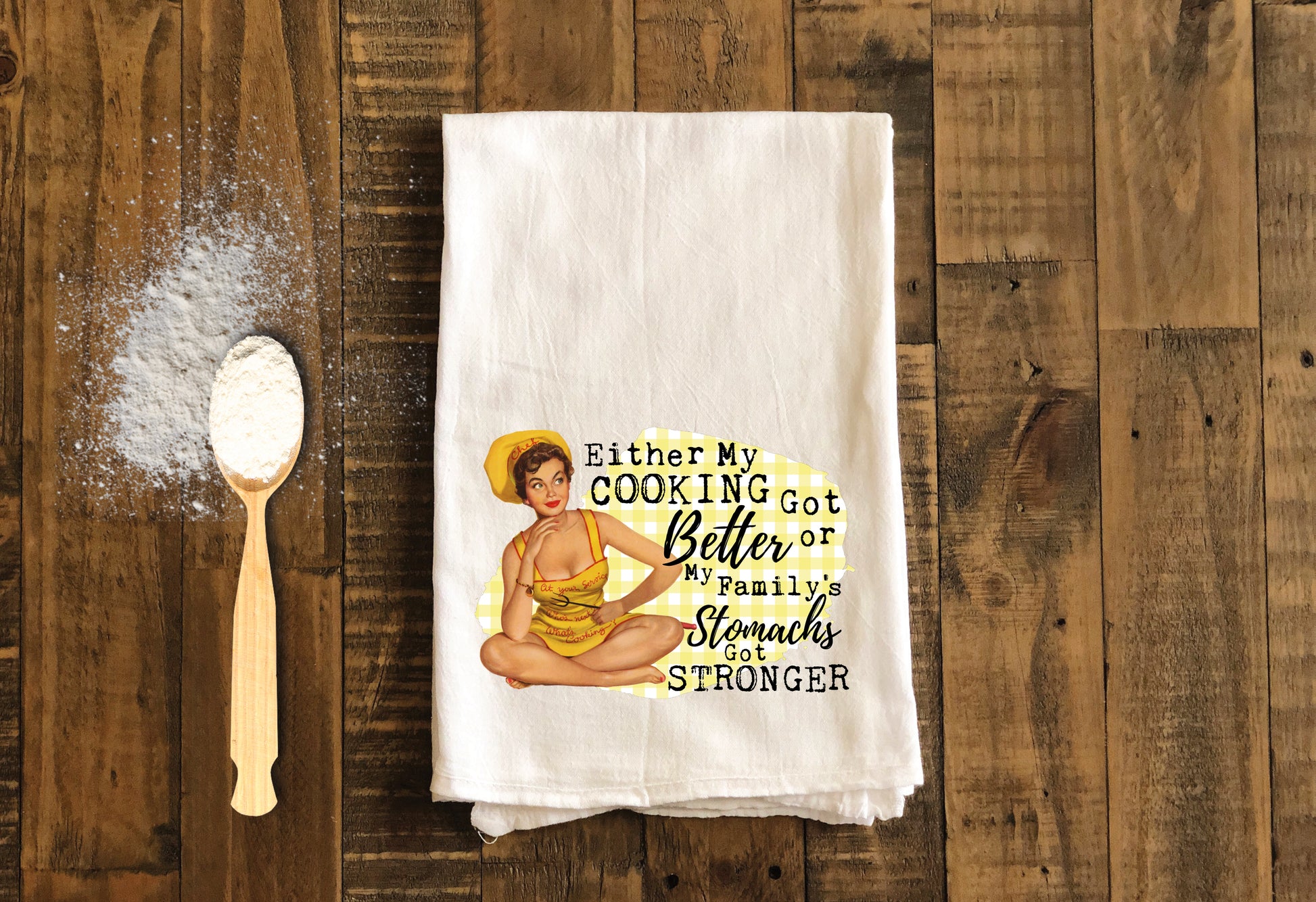 Either My Cooking Got Better - Funny Kitchen Tea Towels - Humorous Flour Sack Dish Towel - Hilarious Housewarming Gift Kitchen Decor