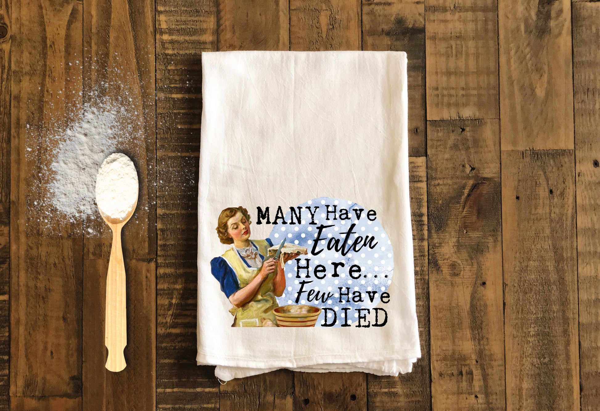 Many Have Eaten Here Few Have Died - Funny Kitchen Tea Towels - Humorous Flour Sack Dish Towel - Hilarious Housewarming Gift Kitchen Decor