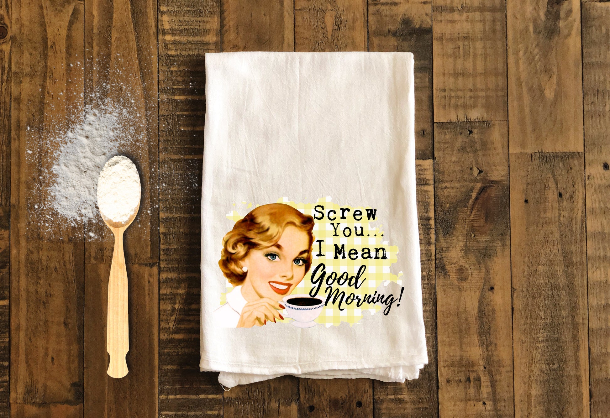 Screw You I Mean Good Morning - Funny Kitchen Tea Towels - Humorous Flour Sack Dish Towel - Hilarious Housewarming Gift Kitchen Decor