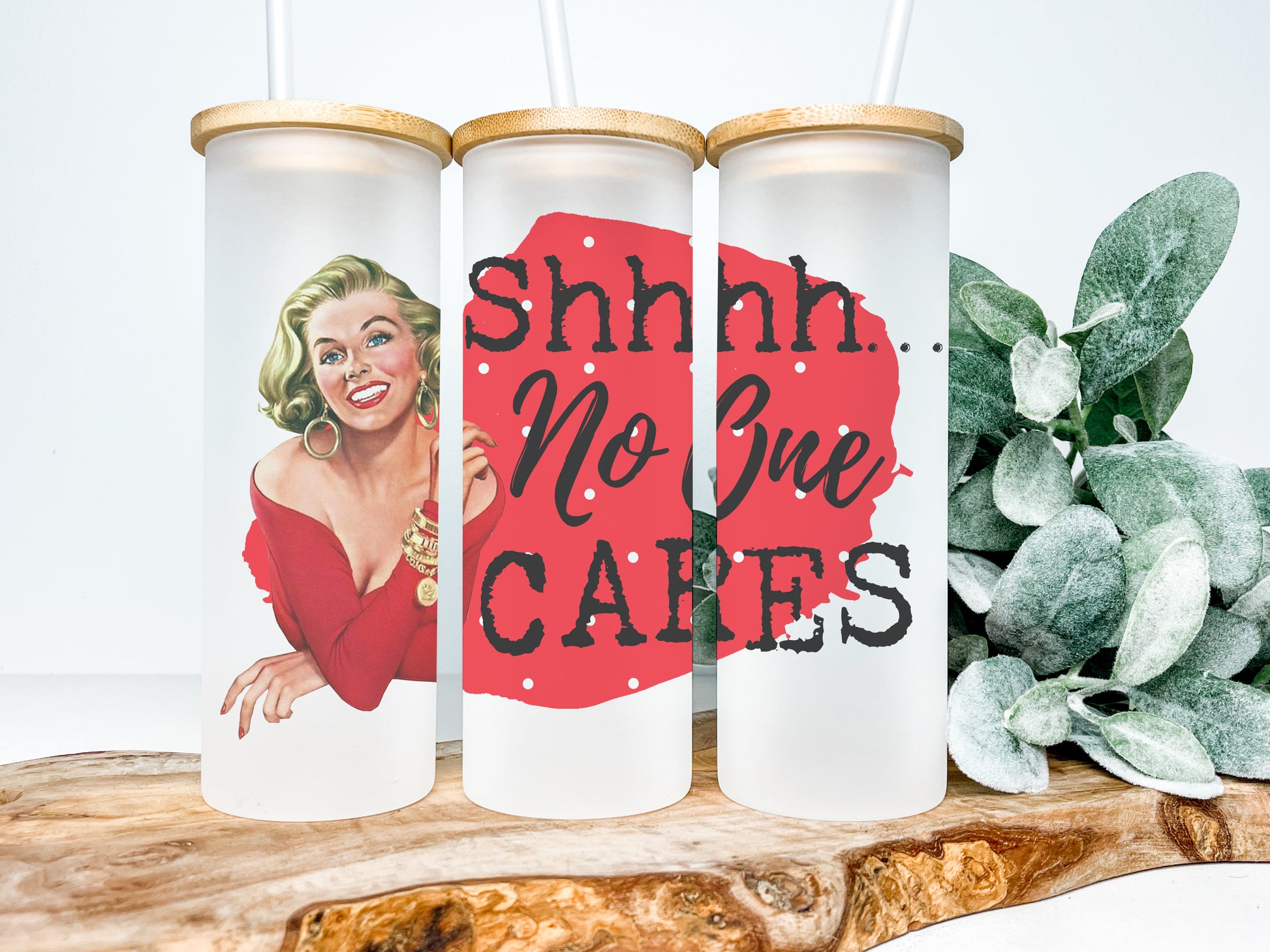 Shhhh No One Cares 25oz Frosted Glass Tumbler, Funny Retro Housewives Tumbler