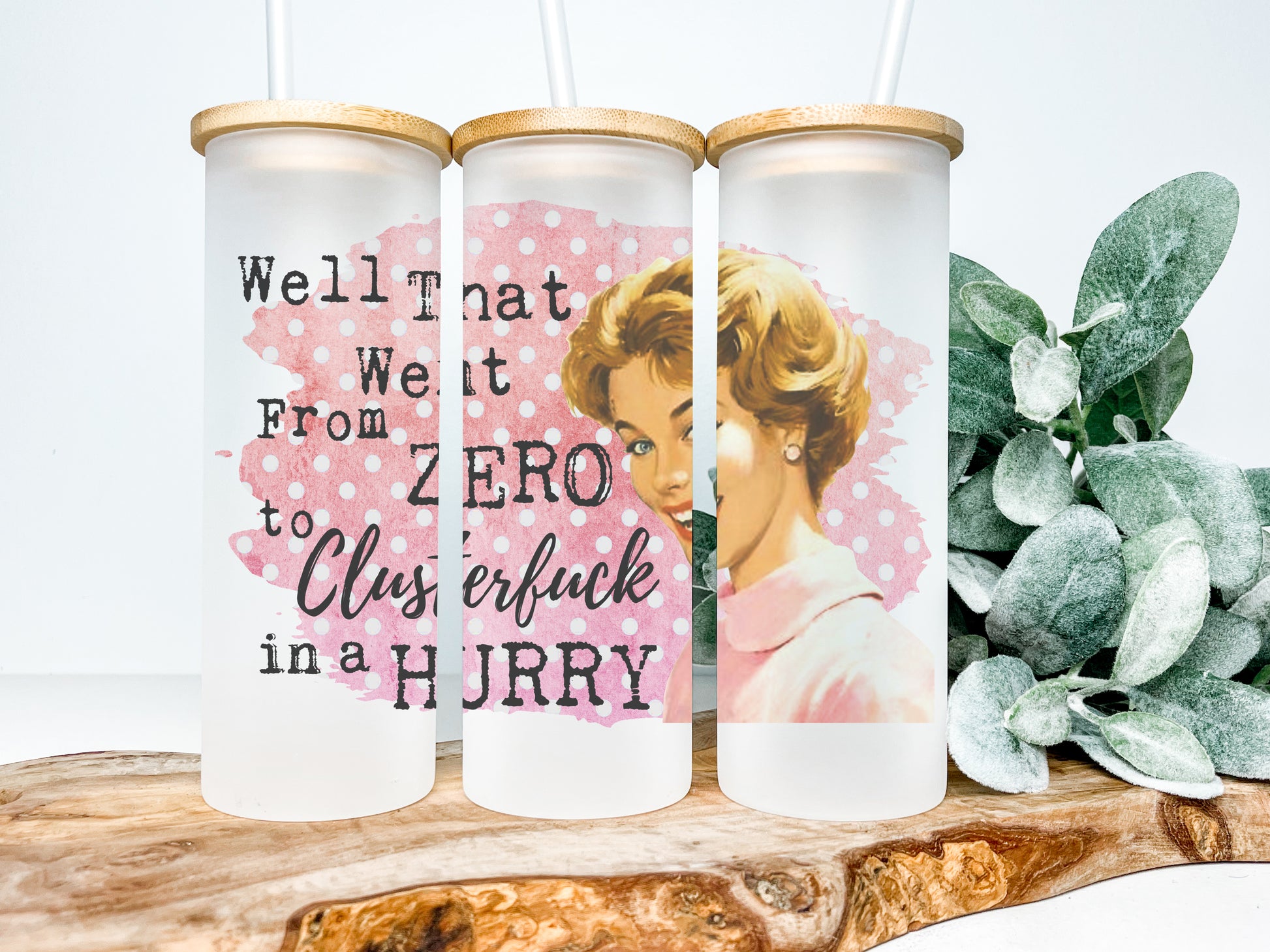 Zero to Clusterf*ck 25oz Frosted Glass Tumbler, Funny Retro Housewives Tumbler