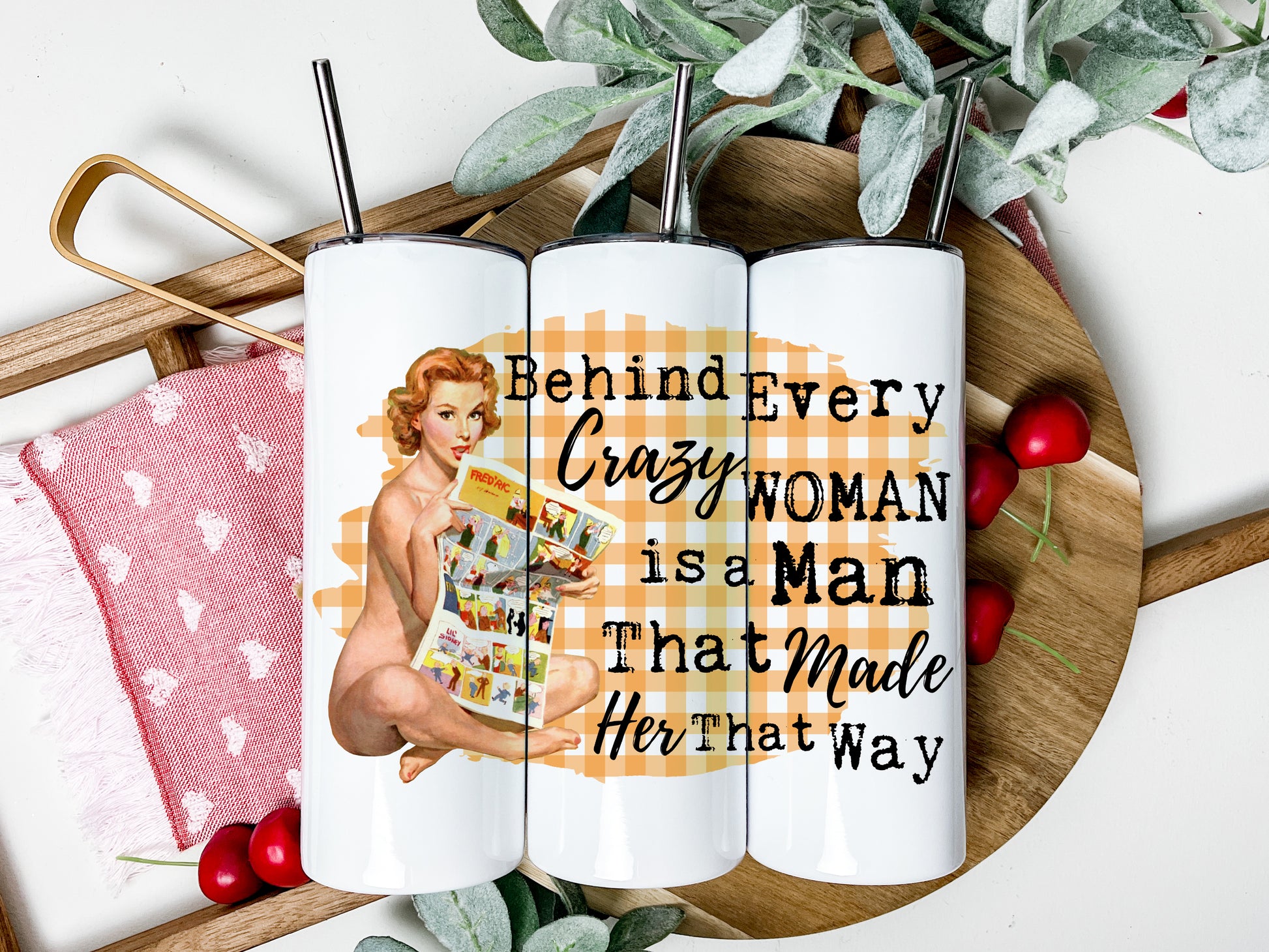Behind Every Crazy Woman Tumbler, Funny Retro Housewives Skinny Tumbler