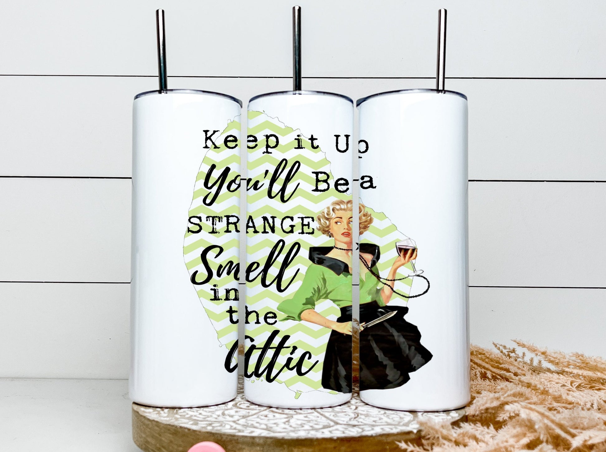 Keep It Up You'll Be a Strange Smell Tumbler, Funny Retro Housewives Skinny Tumbler
