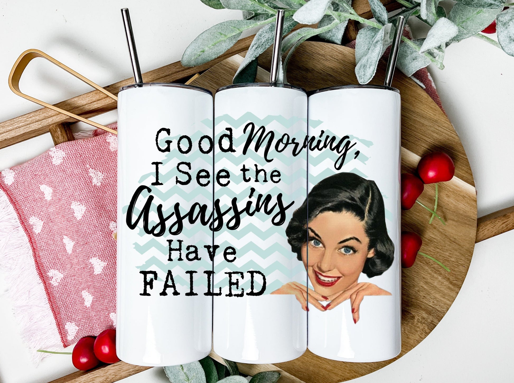 I See the Assassins Have Failed Tumbler, Funny Retro Housewives Skinny Tumbler