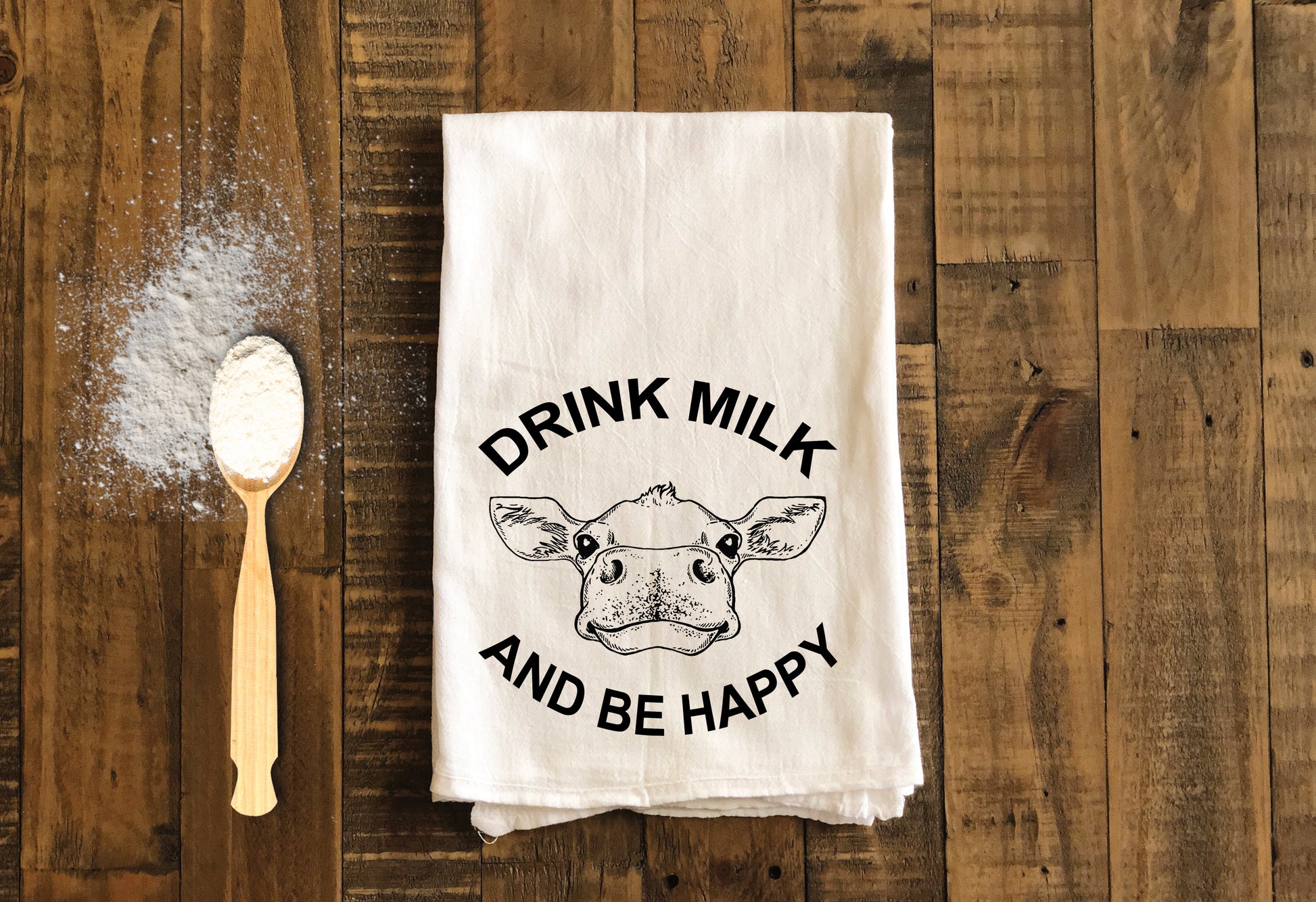 Drink Milk and Be Happy - Funny Kitchen Tea Towels - Humorous Flour Sack Dish Towel - Hilarious Housewarming Gift Kitchen Decor